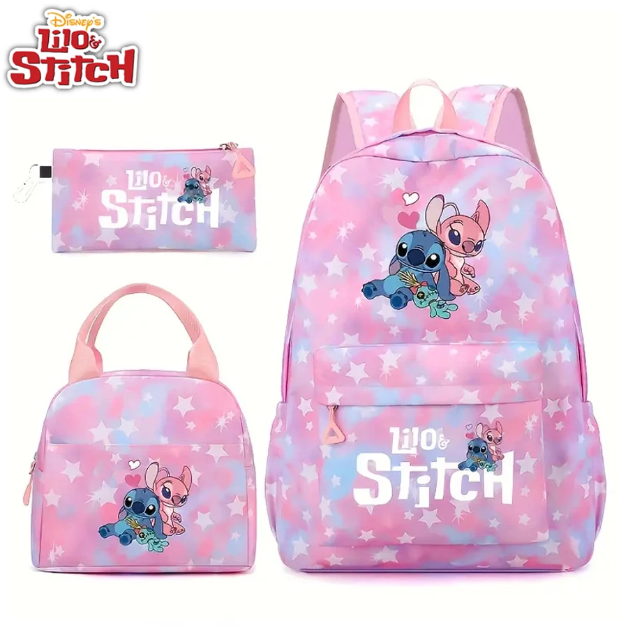 Ovaj razigrani 3-u-1 set s motivima omiljenih crtanih likova Stitch i Angel savršen je izbor za školu, putovanja ili kao poklon. Set uključuje veliki ruksak, kompaktnu torbu za užinu i praktičnu pernicu – svi elementi ukrašeni su veselim ilustracijama u pastelnim ružičasto-plavim tonovima.