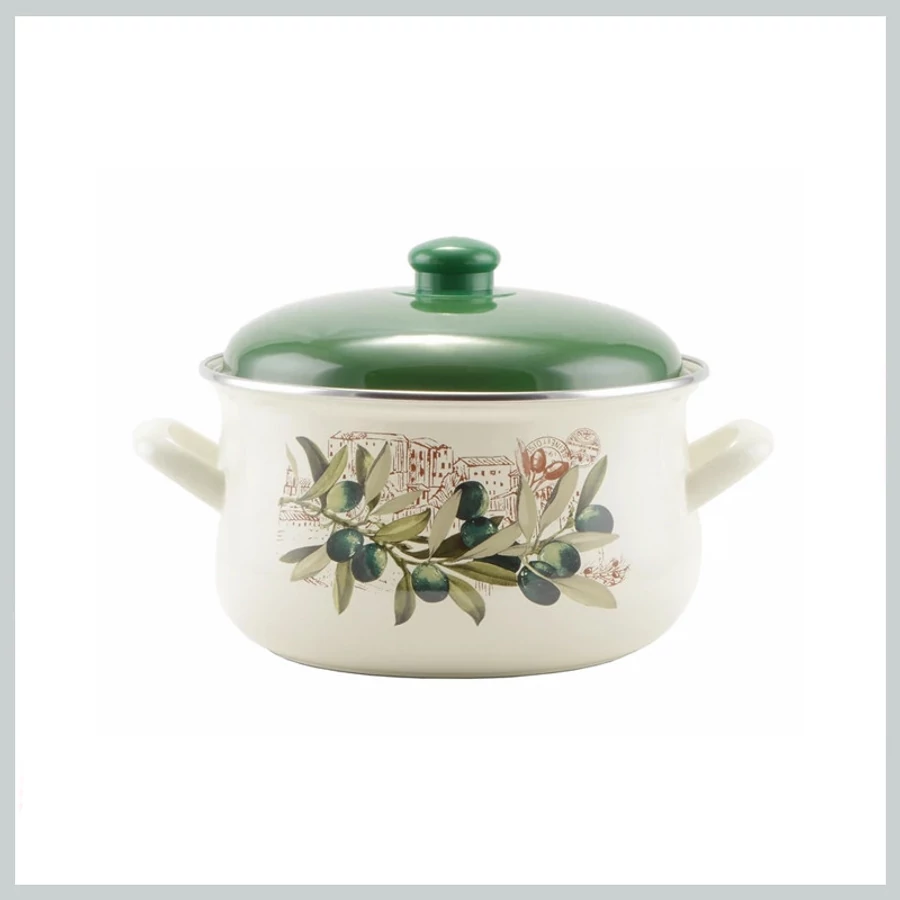 Ovaj emajlirani lonac s poklopcem, ukrašen motivom maslina, savršen je za pripremu variva, juha i drugih jela. Čvrsta čelična konstrukcija s emajliranim premazom osigurava dugotrajnu upotrebu, ravnomjerno zagrijavanje i jednostavno čišćenje.