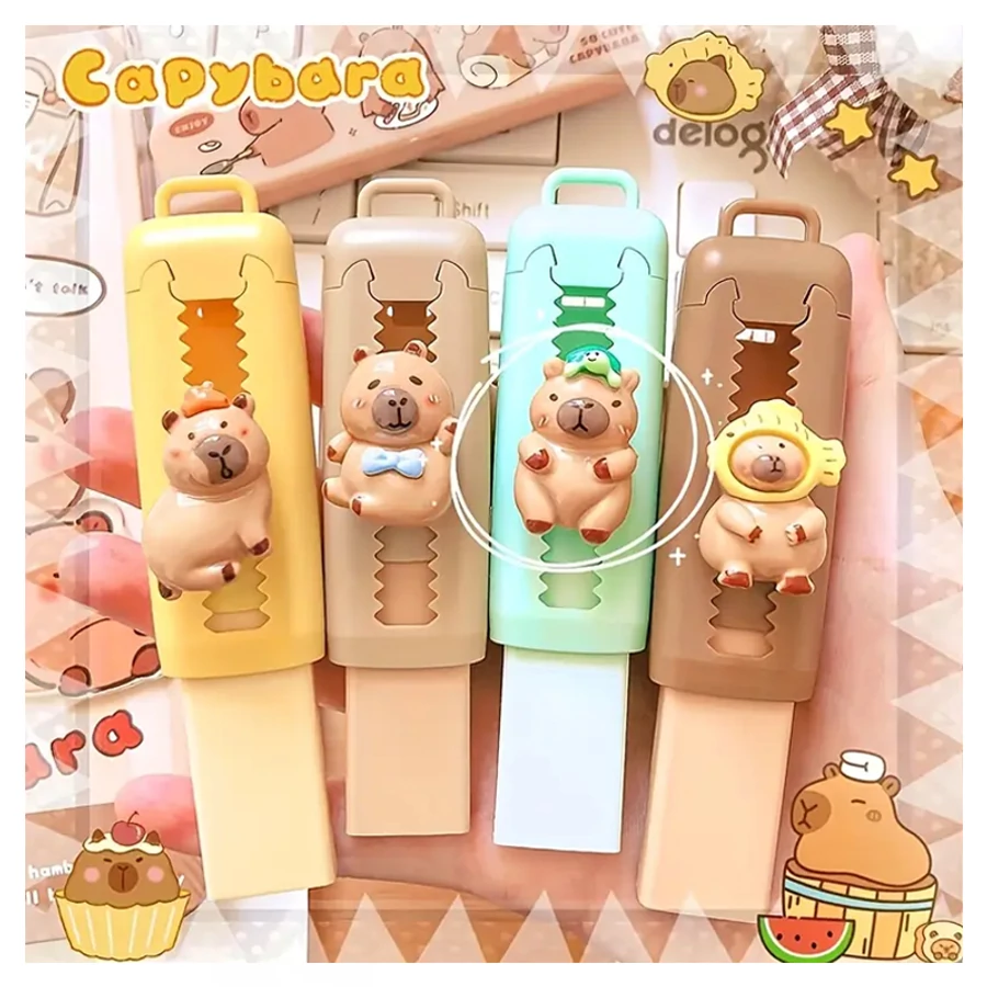 Ovaj set od 4 gumice s kapibarama nije samo izuzetno sladak, već i praktičan. Svaka gumica dolazi u plastičnom kućištu s mehanizmom za izbacivanje, a ukrašena je različitim 3D figuralnim kapibara dizajnom. Fleksibilan, izdržljiv materijal osigurava dugotrajnu upotrebu, dok razigrani izgled razveseljava svakog korisnika – bilo u školi, kod kuće ili u uredu.