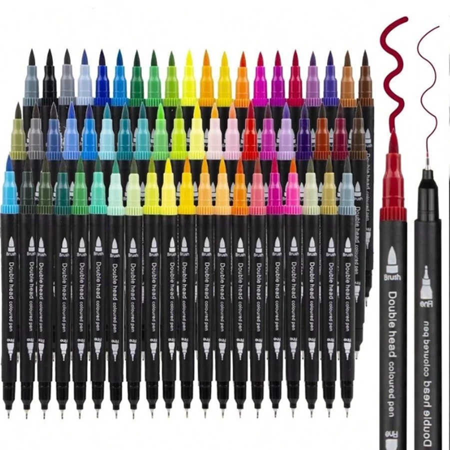 Ovaj set od 60 dvostrukih flomastera idealan je izbor za sve uzraste koji vole crtati, bojati ili voditi kreativne dnevnike. Bogat izbor boja i dva različita vrha omogućuju raznovrsnu upotrebu – od detaljnih ilustracija, akvarel efekta do živopisne kaligrafije. Tinta na bazi vode je netoksična, brzo se suši i ne probija papir.
