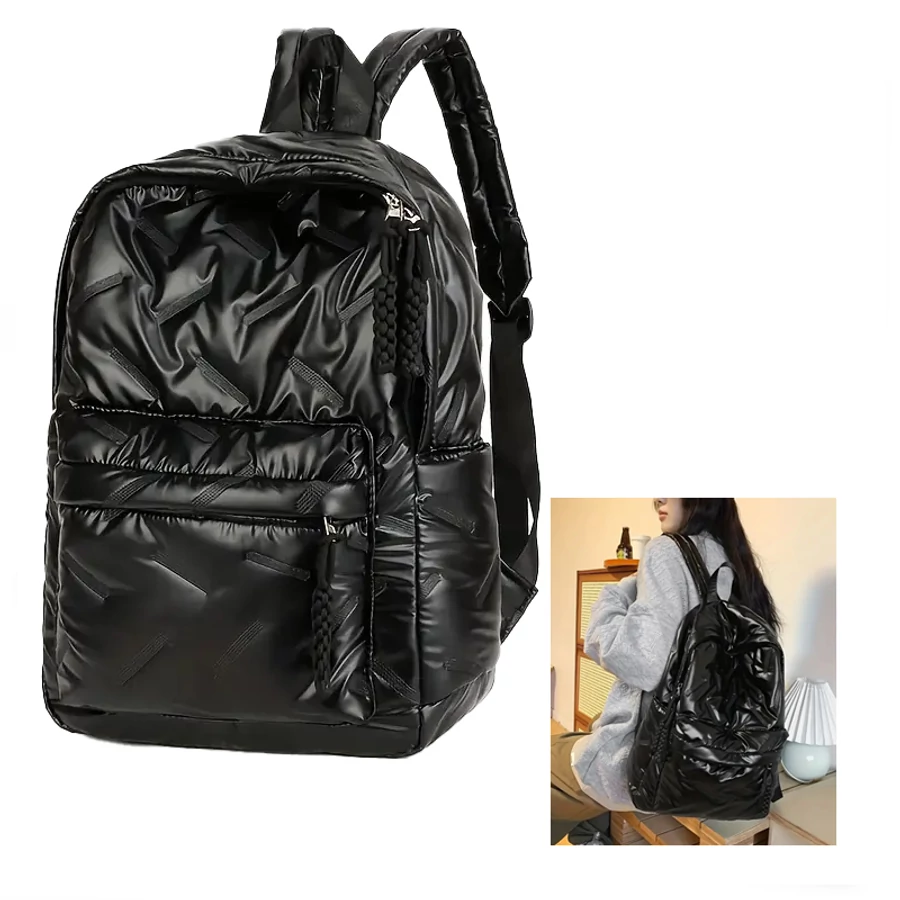 Ovaj moderan i elegantan prošiveni ruksak u posebnoj crnoj metalik boji i s podstavljenim dizajnom idealan je za svakodnevnu gradsku upotrebu, putovanja ili sportski stil. Sjajni materijal i dekorativni šavovi daju torbi poseban i upečatljiv izgled.
