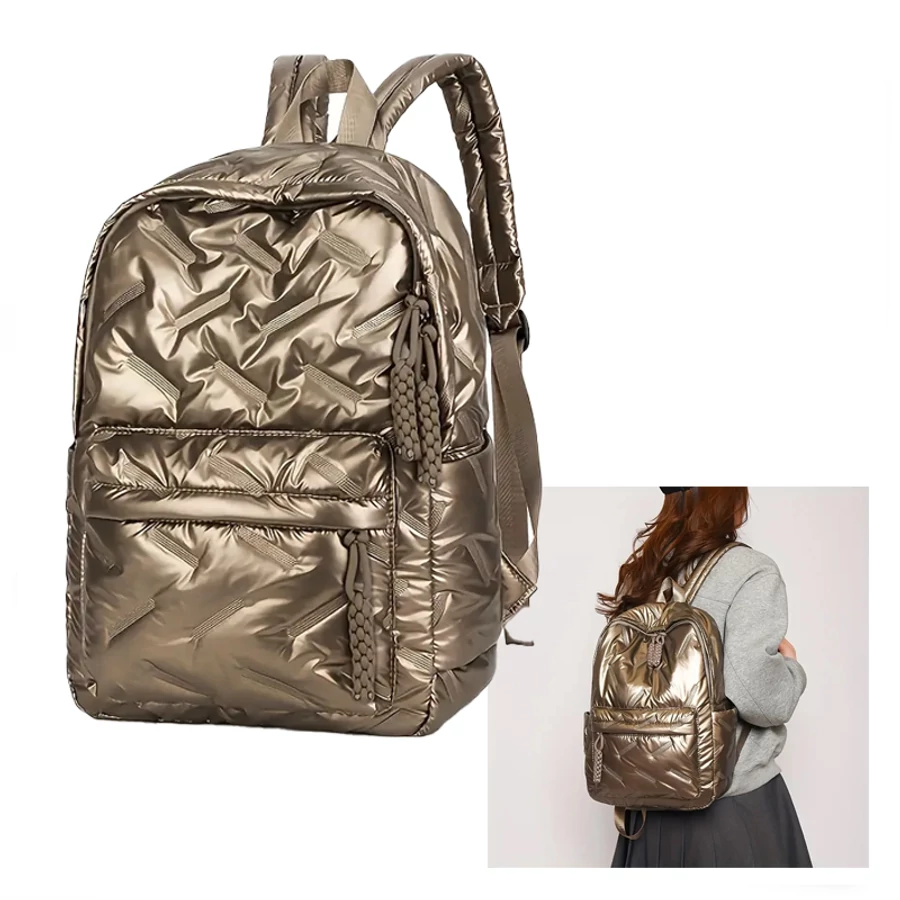 Ovaj moderan i trendi prošiveni ruksak u zlatno-brončanoj metalik boji s podstavljenim dizajnom savršen je izbor za svakodnevnu gradsku upotrebu, putovanja ili sportsku kombinaciju. Sjajni materijal i dekorativni šavovi daju mu poseban, upečatljiv izgled.