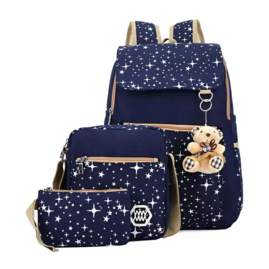 Ovaj veseo i praktičan školski set izvrstan je izbor za početak škole, putovanja ili svakodnevnu upotrebu. Set se sastoji od tri torbe različitih veličina i funkcija, izrađenih u istoj boji s uzorkom zvjezdica – korisne su i vizualno savršeno usklađene.