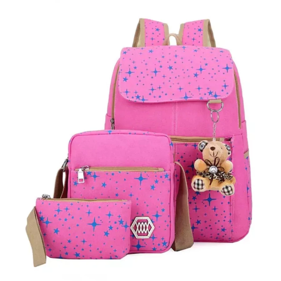 Ovaj veseo i praktičan školski set odličan je izbor za početak škole, putovanja ili svakodnevnu upotrebu. Set se sastoji od tri torbe različitih veličina i funkcija, izrađenih u istoj boji s uzorkom zvjezdica – korisne su i vizualno savršeno usklađene.